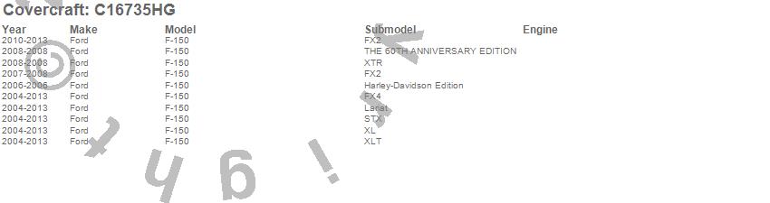 Below is an abbreviated list of applications for the Custom Fit Cab Cover.F-150, Ford, 2013, 2012, 2011, 2010, 2009, 2008, 2007, 2006, 2005, 2004