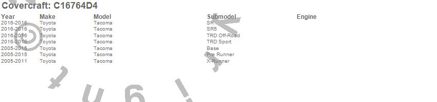 Below is an abbreviated list of applications for the Custom Fit Cab Cover.Tacoma, Toyota, 2016, 2015, 2014, 2013, 2012, 2011, 2010, 2009, 2008, 2007, 2006, 2005