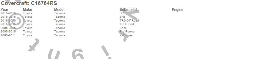 Below is an abbreviated list of applications for the Custom Fit Cab Cover.Tacoma, Toyota, 2016, 2015, 2014, 2013, 2012, 2011, 2010, 2009, 2008, 2007, 2006, 2005
