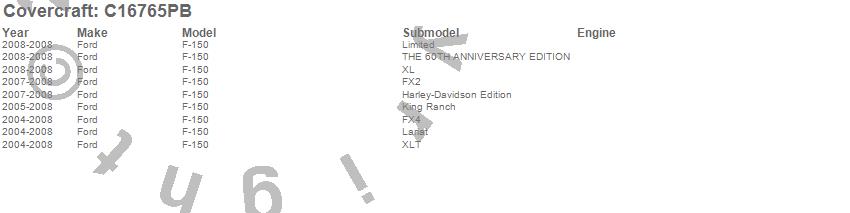 Below is an abbreviated list of applications for the Custom Fit Cab Cover.F-150, Ford, 2008, 2007, 2006, 2005, 2004