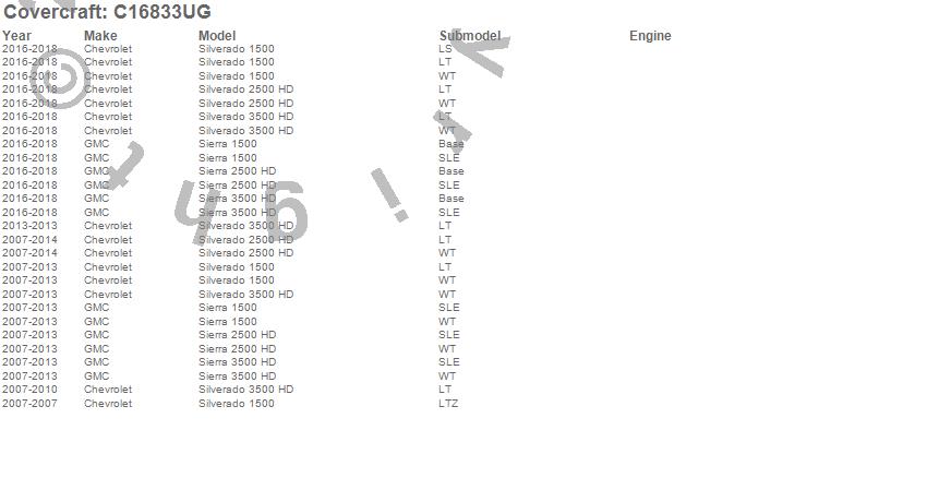 Below is an abbreviated list of applications for the Custom Fit Cab Cover.Sierra 1500, Sierra 2500 HD, Sierra 3500 HD, Silverado 1500, Silverado 2500 HD, Silverado 3500 HD, Chevrolet, GMC, 2018, 2017, 2016, 2014, 2013, 2012, 2011, 2010, 2009, 2008, 2007