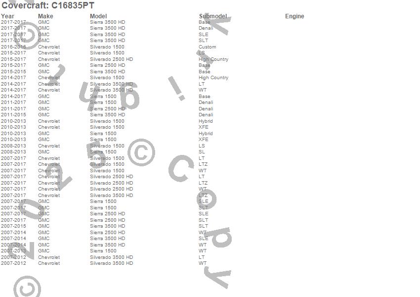 Below is an abbreviated list of applications for the Custom Fit Cab Cover.Sierra 1500, Sierra 2500 HD, Sierra 3500 HD, Silverado 1500, Silverado 2500 HD, Silverado 3500 HD, Chevrolet, GMC, 2017, 2016, 2015, 2014, 2013, 2012, 2011, 2010, 2009, 2008, 2007