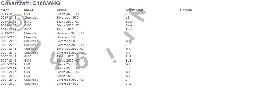 Below is an abbreviated list of applications for the Custom Fit Cab Cover.Sierra 1500, Sierra 2500 HD, Sierra 3500 HD, Silverado 1500, Silverado 2500 HD, Silverado 3500 HD, Chevrolet, GMC, 2018, 2017, 2016, 2015, 2014, 2013, 2012, 2011, 2010, 2009, 2008, 2007