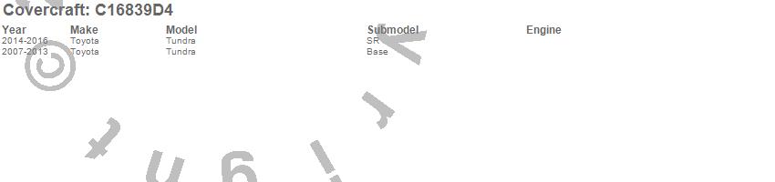 Below is an abbreviated list of applications for the Custom Fit Cab Cover.Tundra, Toyota, 2016, 2015, 2014, 2013, 2012, 2011, 2010, 2009, 2008, 2007