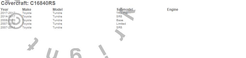 Below is an abbreviated list of applications for the Custom Fit Cab Cover.Tundra, Toyota, 2017, 2016, 2015, 2014, 2013, 2012, 2011, 2010, 2009, 2008, 2007