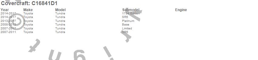 Below is an abbreviated list of applications for the Custom Fit Cab Cover.Tundra, Toyota, 2017, 2016, 2015, 2014, 2013, 2012, 2011, 2010, 2009, 2008, 2007