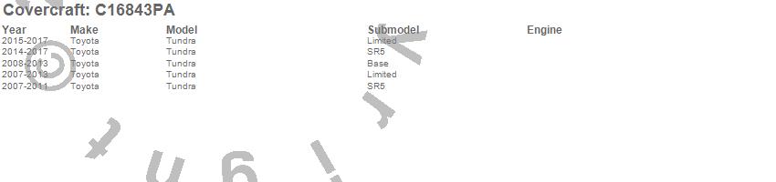 Below is an abbreviated list of applications for the Custom Fit Cab Cover.Tundra, Toyota, 2017, 2016, 2015, 2014, 2013, 2012, 2011, 2010, 2009, 2008, 2007