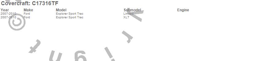 Below is an abbreviated list of applications for the Custom Fit Cab Cover.Explorer Sport Trac, Ford, 2010, 2009, 2008, 2007