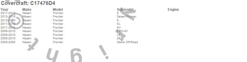 Below is an abbreviated list of applications for the Custom Fit Cab Cover.Frontier, Nissan, 2018, 2017, 2016, 2015, 2014, 2013, 2012, 2011, 2010, 2009, 2008, 2007, 2006, 2005