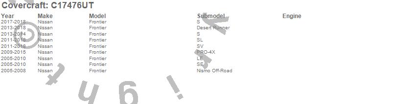 Below is an abbreviated list of applications for the Custom Fit Cab Cover.Frontier, Nissan, 2018, 2017, 2016, 2015, 2014, 2013, 2012, 2011, 2010, 2009, 2008, 2007, 2006, 2005