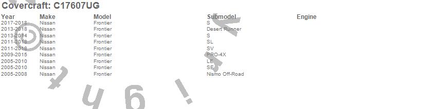 Below is an abbreviated list of applications for the Custom Fit Cab Cover.Frontier, Nissan, 2018, 2017, 2016, 2015, 2014, 2013, 2012, 2011, 2010, 2009, 2008, 2007, 2006, 2005