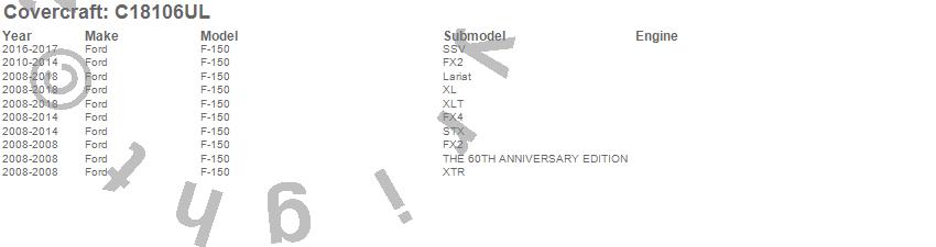 Below is an abbreviated list of applications for the Custom Fit Cab Cover.F-150, Ford, 2018, 2017, 2016, 2015, 2014, 2013, 2012, 2011, 2010, 2009, 2008