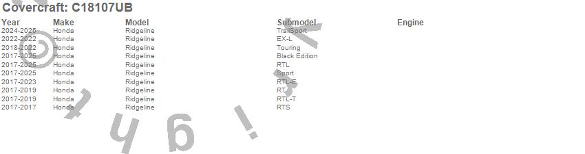 Below is an abbreviated list of applications for the Custom Fit Cab Cover.Ridgeline, Honda, 2025, 2024, 2023, 2022, 2021, 2020, 2019, 2018, 2017