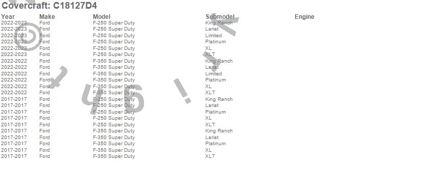 Below is an abbreviated list of applications for the Custom Fit Cab Cover.F-250 Super Duty, F-350 Super Duty, Ford, 2023, 2022, 2017