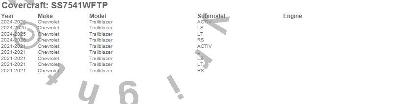 Below is an abbreviated list of applications for the SeatSaver Custom Seat Cover.Trailblazer, Chevrolet, 2025, 2024, 2021