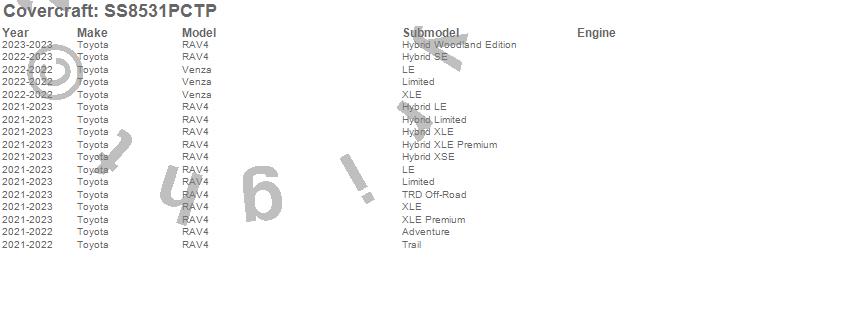 Below is an abbreviated list of applications for the SeatSaver Custom Seat Cover.RAV4, Venza, Toyota, 2025, 2024, 2023, 2022, 2021