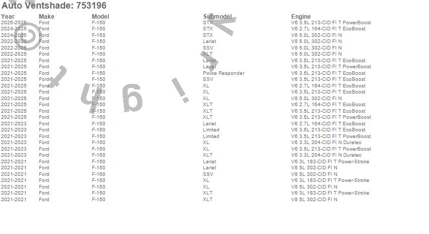 Below is an abbreviated list of applications for the Aeroskin LightShield Hood Protector.F-150, Ford, 2025, 2024, 2023, 2022, 2021