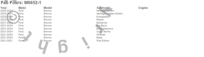Below is an abbreviated list of applications for the Adaptive Cruise Control Relocation Bracket.Bronco, Ford, 2025, 2024, 2023, 2022, 2021