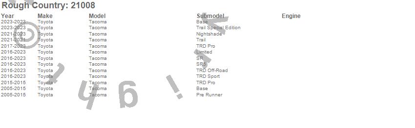 Brand: Rough CountryPart Number: 21008Nerf/Step Bar Type: Pair - Black - Incl. HardwareUPC: 840269945281