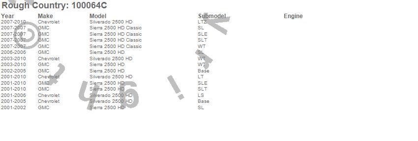Below is an abbreviated list of applications for the Air Spring Kit.Sierra 2500 HD, Sierra 2500 HD Classic, Silverado 2500 HD, Chevrolet, GMC, 2010, 2009, 2008, 2007, 2006, 2005, 2004, 2003, 2002, 2001