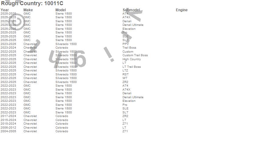 Below is an abbreviated list of applications for the Air Spring Kit.Colorado, Sierra 1500, Silverado 1500, Chevrolet, GMC, 2025, 2024, 2023, 2022, 2021, 2020, 2019, 2018, 2017, 2016, 2015, 2012, 2011, 2010, 2009