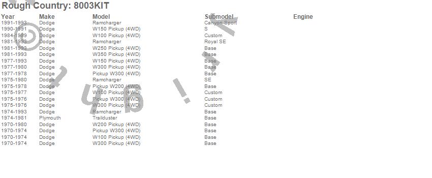 Below is an abbreviated list of applications for the Leaf Spring.Ramcharger, Trailduster, W100 Pickup, W150 Pickup, W200 Pickup, W250 Pickup, W300 Pickup, W350 Pickup, Dodge, Plymouth, 1993, 1992, 1991, 1990, 1989, 1988, 1987, 1986, 1985, 1984