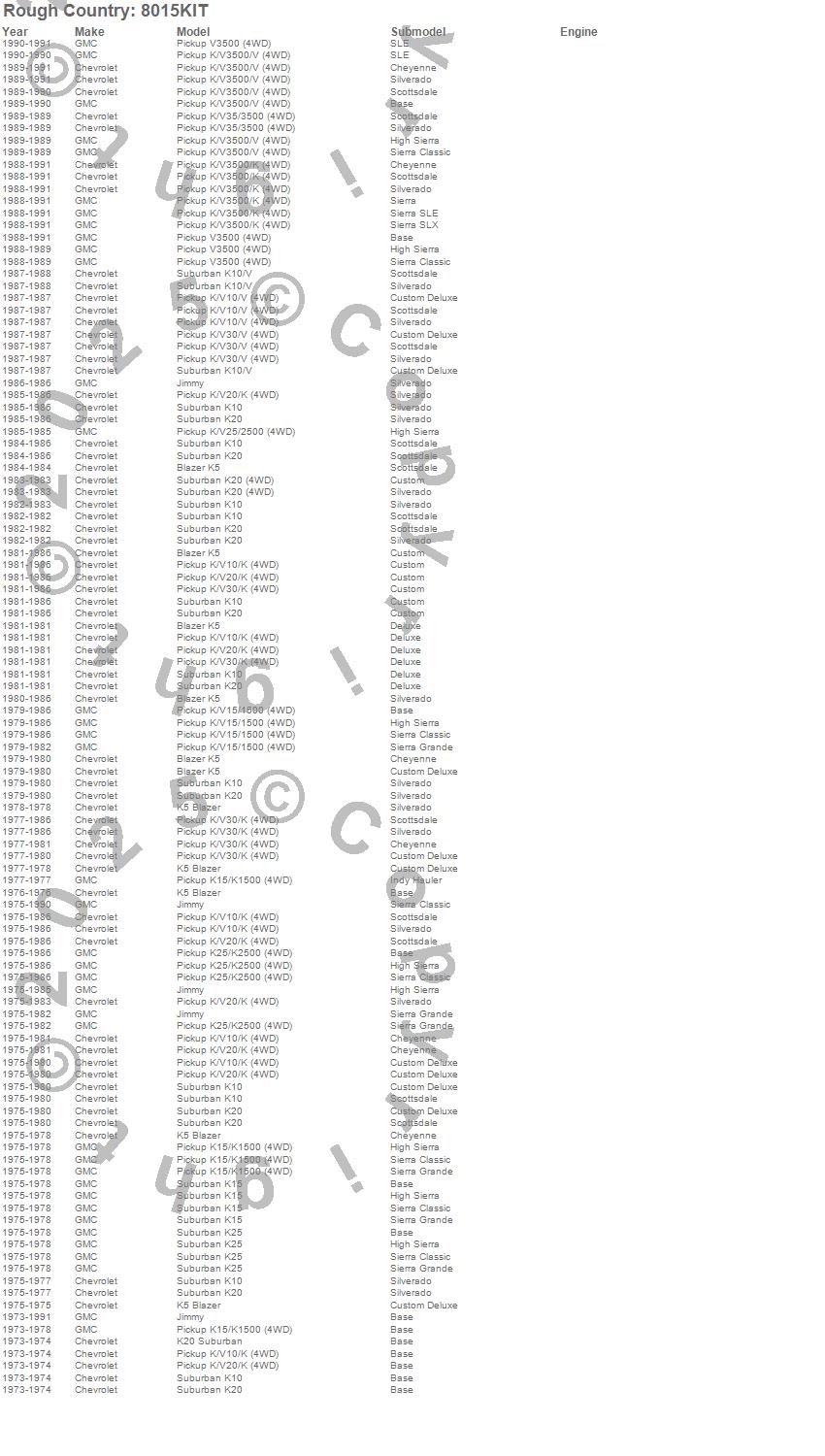 Below is an abbreviated list of applications for the Leaf Spring.Blazer K5, Jimmy, K10 Pickup, K10 Suburban, K15 Suburban, K15/K1500 Pickup, K1500 Pickup, K20 Pickup, K20 Suburban, K25 Pickup, K25 Suburban, K2500 Pickup, K30 Pickup, K3500 Pickup, K5 Blazer, V10 Pickup, V10 Suburban, V30 Pickup, V3500 Pickup, Chevrolet