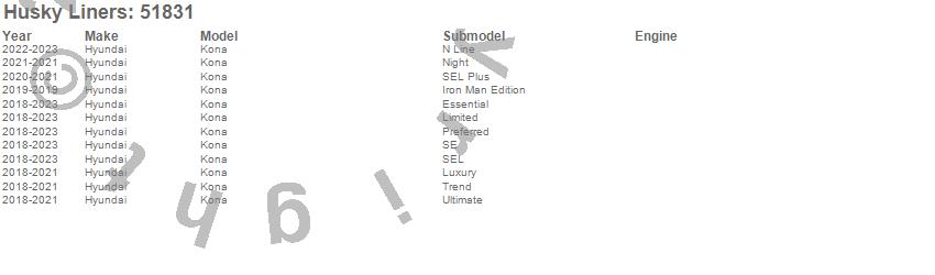 Below is an abbreviated list of applications for the X-act Contour Floor Liner.Kona, Hyundai, 2023, 2022, 2021, 2020, 2019, 2018