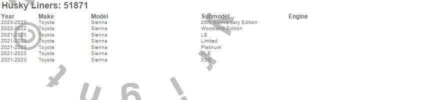 Below is an abbreviated list of applications for the X-act Contour Floor Liner.Sienna, Toyota, 2023, 2022, 2021