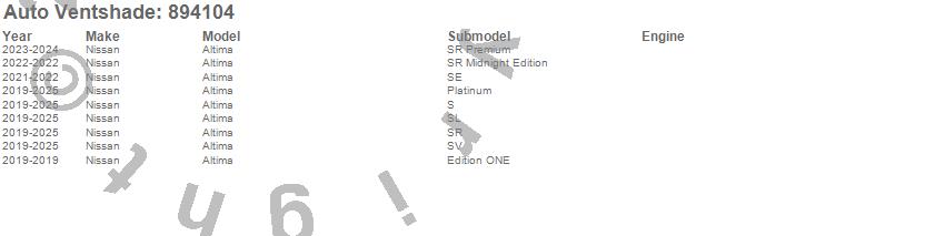 Below is an abbreviated list of applications for the Ventvisor Low Profile Deflector 4 pc..Altima, Nissan, 2025, 2024, 2023, 2022, 2021, 2020, 2019