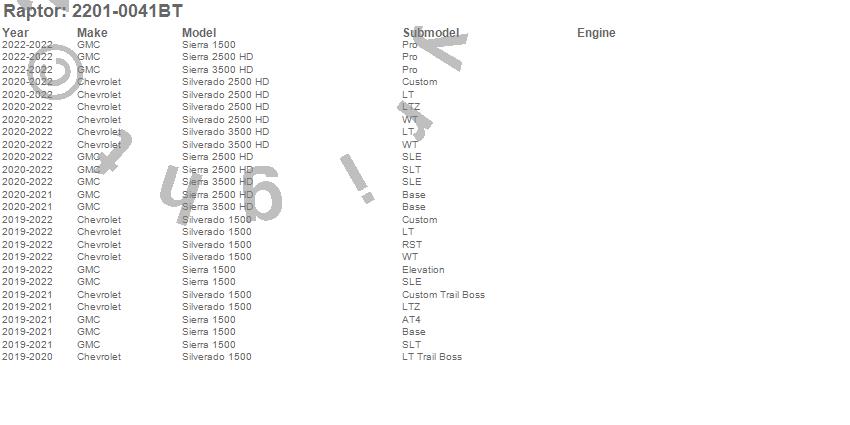 Brand: RaptorPart Number: 2201-0041BTRunning Board Type: Black Textured - Rocker Panel MountUPC: 810075530636