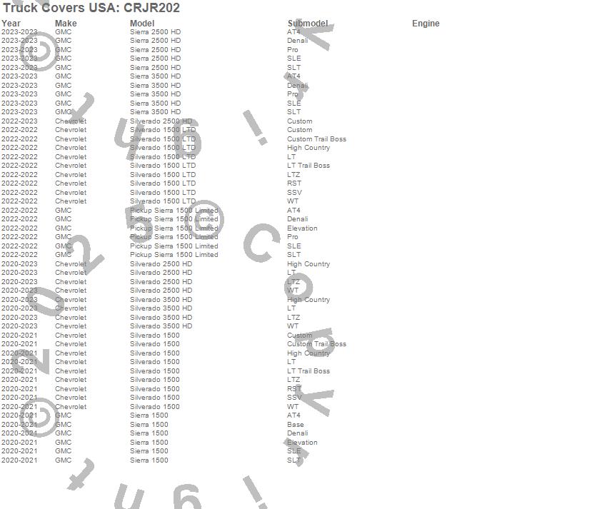 Below is an abbreviated list of applications for the American Work Cover JR..Pickup Sierra 1500 Limited, Sierra 1500, Sierra 2500 HD, Sierra 3500 HD, Silverado 1500, Silverado 1500 LTD, Silverado 2500 HD, Silverado 3500 HD, Chevrolet, GMC, 2023, 2022, 2021, 2020