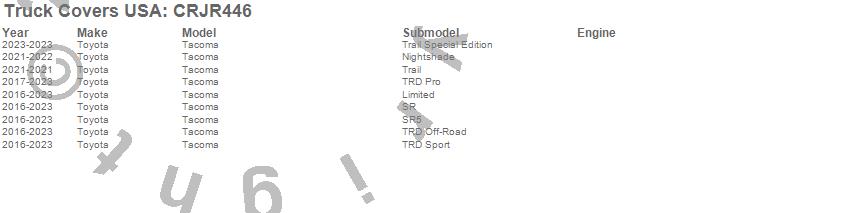Below is an abbreviated list of applications for the American Work Cover JR..Tacoma, Toyota, 2023, 2022, 2021, 2020, 2019, 2018, 2017, 2016