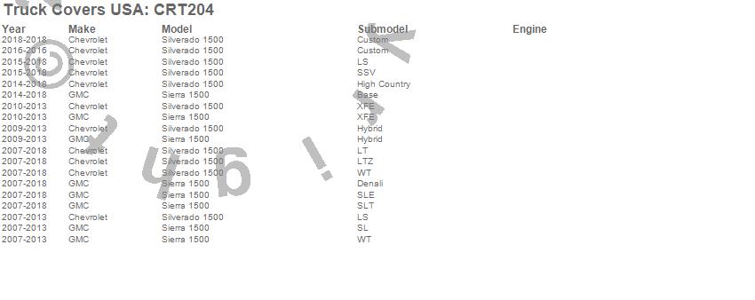 Brand: Truck Covers USAPart Number: CRT204Tonneau Cover Type: 68 in. - Full Size Cover UnitUPC: 887753773340