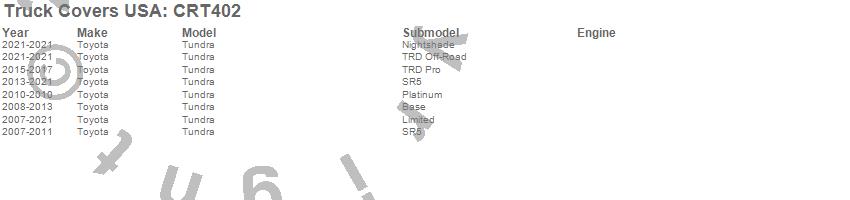 Brand: Truck Covers USAPart Number: CRT402Tonneau Cover Type: 65 in. - Full Size Cover UnitUPC: 887753773784