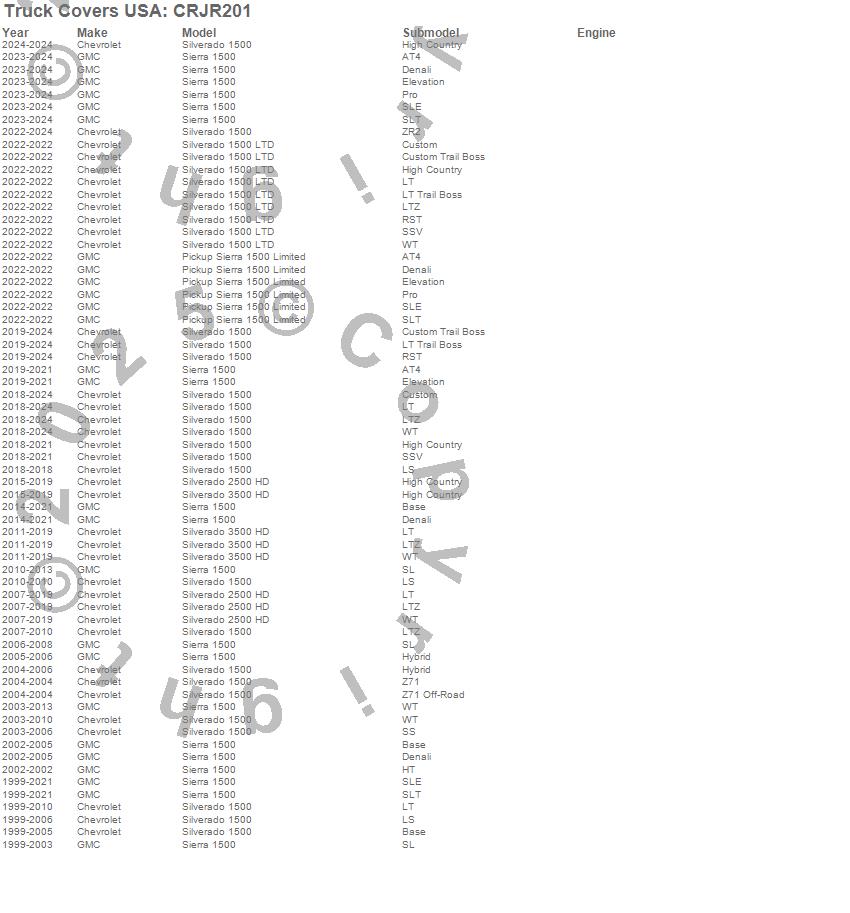 Below is an abbreviated list of applications for the American Work Cover JR..Pickup Sierra 1500 Limited, Sierra 1500, Silverado 1500, Silverado 1500 LTD, Silverado 2500 HD, Silverado 3500 HD, Chevrolet, GMC, 2024, 2023, 2022, 2021, 2020, 2019, 2018, 2017, 2016, 2015, 2014, 2013