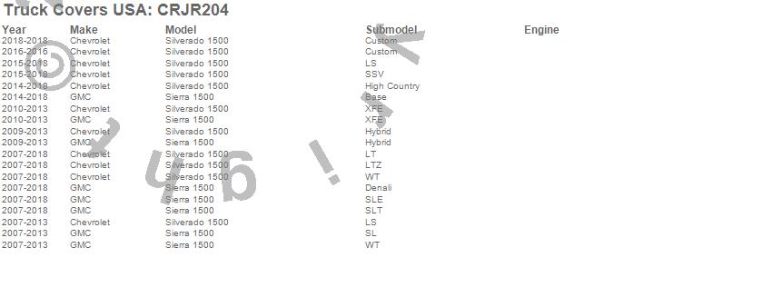 Below is an abbreviated list of applications for the American Work Cover JR..Sierra 1500, Silverado 1500, Chevrolet, GMC, 2018, 2017, 2016, 2015, 2014, 2013, 2012, 2011, 2010, 2009, 2008, 2007