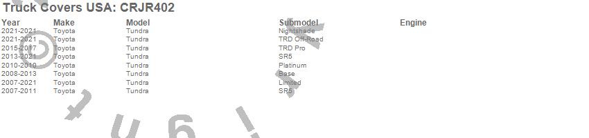 Below is an abbreviated list of applications for the American Work Cover JR..Tundra, Toyota, 2021, 2020, 2019, 2018, 2017, 2016, 2015, 2014, 2013, 2012, 2011, 2010, 2009, 2008, 2007