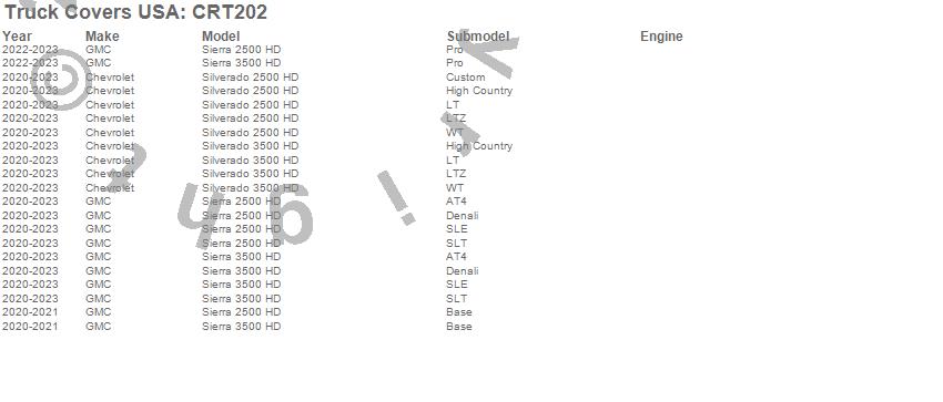 Brand: Truck Covers USAPart Number: CRT202Tonneau Cover Type: 82 in. - Full Size Cover UnitUPC: 887753773272