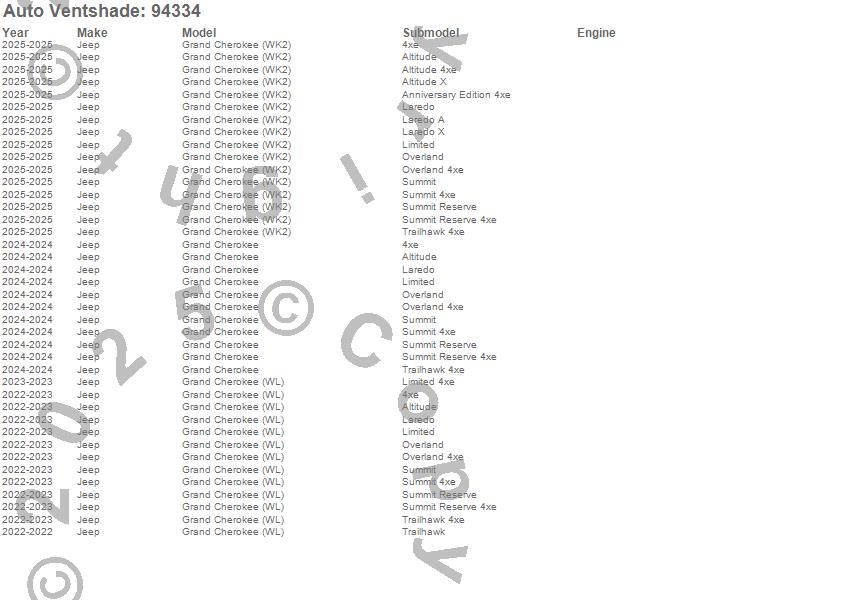 Below is an abbreviated list of applications for the Ventvisor Deflector 4 pc..Grand Cherokee, Grand Cherokee (WK2), Grand Cherokee (WL), Jeep, 2025, 2024, 2023, 2022