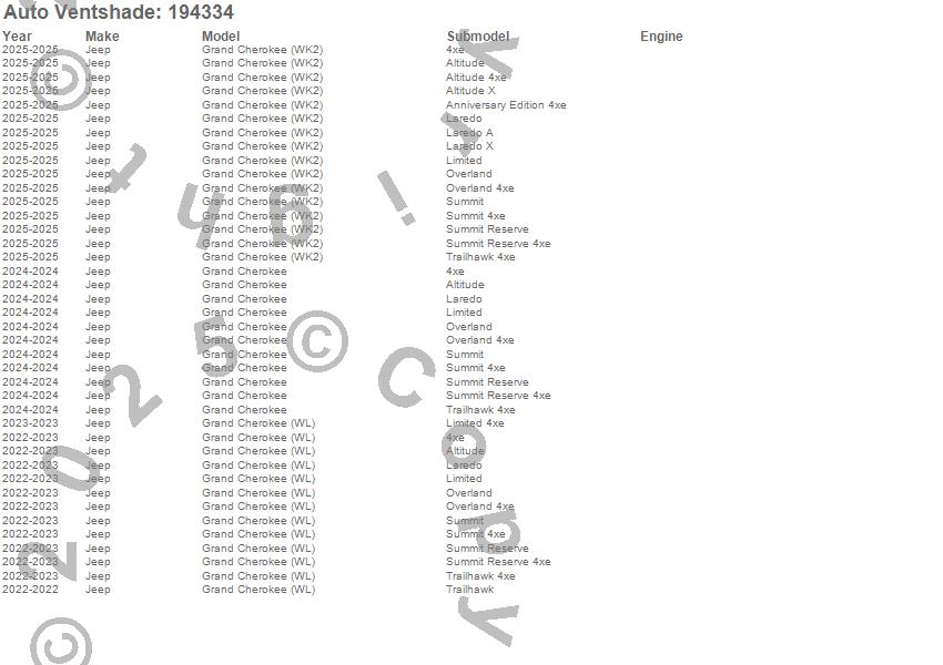 Below is an abbreviated list of applications for the Ventvisor In-Channel Deflector 4 pc..Grand Cherokee, Grand Cherokee (WK2), Grand Cherokee (WL), Jeep, 2025, 2024, 2023, 2022