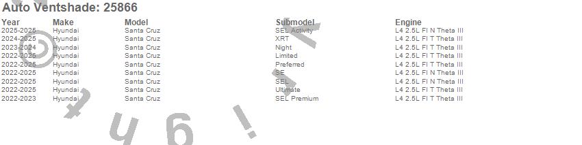 Below is an abbreviated list of applications for the Bugflector II Stone/Bug Deflector.Santa Cruz, Hyundai, 2025, 2024, 2023, 2022