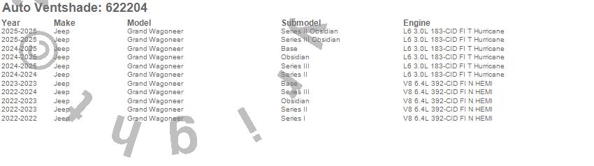 Below is an abbreviated list of applications for the Aeroskin Chrome Hood Protector.Grand Wagoneer, Jeep, 2025, 2024, 2023, 2022
