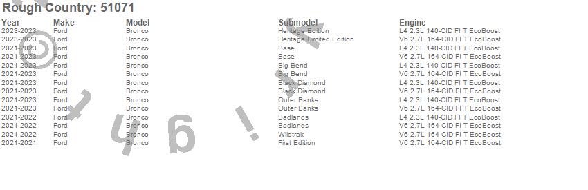 Below is an abbreviated list of applications for the Lift Kit-Suspension.Bronco, Ford, 2025, 2024, 2023, 2022, 2021