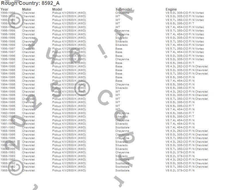 Below is an abbreviated list of applications for the Front Leveling Kit.K2500 Pickup, Chevrolet, 1998, 1997, 1996, 1995, 1994, 1993, 1992, 1991, 1990, 1989, 1988