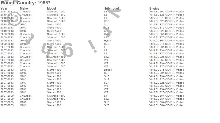 Below is an abbreviated list of applications for the Suspension Lift Kit w/Shocks.Sierra 1500, Silverado 1500, Chevrolet, GMC, 2013, 2012, 2011, 2010, 2009, 2008, 2007