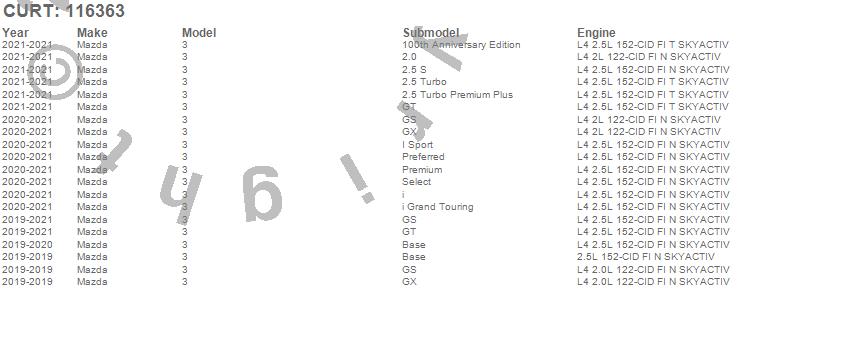 Below is an abbreviated list of applications for the Class I 1.25 in. Receiver Hitch.3, Mazda, 2021, 2020, 2019
