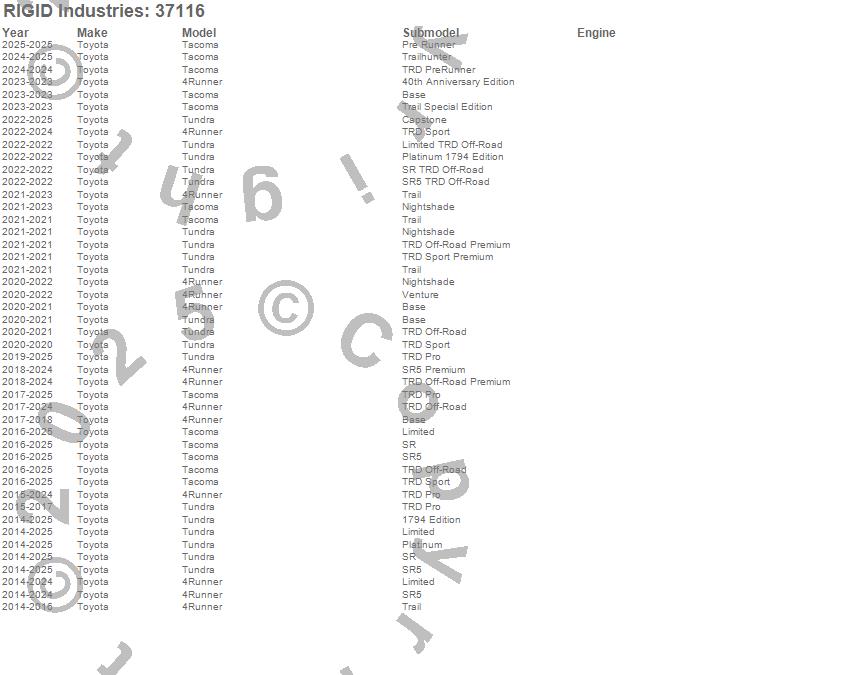Below is an abbreviated list of applications for the 360-Series Pro Fog Light.4Runner, Tacoma, Tundra, Toyota, 2026, 2025, 2024, 2023, 2022, 2021, 2020, 2019, 2018, 2017, 2016, 2015, 2014