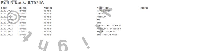 Below is an abbreviated list of applications for the Roll-N-Lock A-Series Truck Bed Cover.Tundra, Toyota, 2025, 2024, 2023, 2022