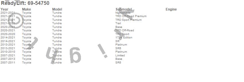 Below is an abbreviated list of applications for the Lift Kit w/Shocks.Tundra, Toyota, 2021, 2020, 2019, 2018, 2017, 2016, 2015, 2014, 2013, 2012, 2011, 2010, 2009, 2008, 2007